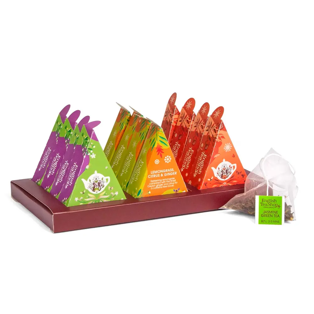 🎁 Mit einer Schleife verziert, ist diese Classic-Kollektion nicht nur etwas für Einsteiger. 12 verschiedene Sorten unserer besten BIO Tees, wie z.B. Earl Grey, Lemongras-Ingwer-Zitrus oder Super Beeren sind in diesem Tee Geschenk mit handegebundener Schleife. Da muss man einfach zugreifen! 🍵 Alle enthaltenen BIO-Teesorten sind in loser Tee Qualität in praktischen, großvolumigen Tee-Pyramiden verpackt. Bei der Zubereitung können die Zutaten ihr optimales Aroma entfalten und erfreuen alle Teefreunde mit ihrem außergewöhnlichen Geschmack. Ein wunderbares Tee Geschenkset für alle Teeliebhaber, Männer, Frauen, Freundin, Freund, Geschwister und Eltern. ✨ Das schicke Verpackungsdesign mit den pyramidenförmigen Schachteln und einer handgebunden Geschenkschleife macht dieses klassische Tee-Set als Probierbox zu einer besonders liebenswerten Tee Geschenkidee. Fertig verpackt kann das Teegeschenk direkt als Präsent übergeben werden und ist eine moderne Alternative zum traditionellen Geschenkkorb zu vielen Anlässen, z.B. zum Geburtstag, Ostern, Weihnachten, Valentinstag, Muttertag oder anderen Festtagen. 🌱 KOMPOSTIERBAR: Wir verwenden zur Herstellung unserer Pyramidenbeutel nachwachsende Rohstoffe. Die Pyramidenbeutel sind daher plastikfrei & kompostierbar. Inhalt: 12 Pyramiden-Teebeutel Geschmack: 12 verschiedene Sorten. Tipp: Fertig verpacktes Geschenk mit Schleife. Zutaten: 1 x Grüner Tee Granatapfel - Grüner Tee aromatisiert, BIO Grüner Tee (91%)*, natürliches Aroma (5%) Granatapfel (3%)*, Rosenblätter (1%)*, 1 x Schokolade, Rooibos & Vanille - Rooibostee aromatisiert, BIO Rooibos (88,5%)*, Kakaonibs (6%)*, natürliches Aroma (5%) Vanilleschote (0,5%)*, 1 x Weißer Tee - Weißer Tee, BIO Weißer Tee (100%)* 1 x Super Beeren - Früchtetee aromatisiert, BIO Hibiskus (63%)*, Rooibos (19%)*, natürliches Aroma (5%), Grüne Minze (Spearmint) (4%)*, Himbeeren (3%)*, Erdbeeren (3%)*, Blaubeeren (3%)* 1 x Earl Grey - Schwarzer Tee aromatisiert, Fairtrade & BIO Schwarzer Ceylon Tee (97,25%)*, Bergamotteöl (2,75%) 1x Jasmin grüner Tee - Grüner Tee aromatisiert, Fairtrade & BIO Grüner Tee (92%)*,Jasminblüte (3,25%)*, Holunderblüten (2%)*, natürliches Aroma (2,75 %)1 x English Breakfast - Schwarzer Tee, Fairtrade & BIO Schwarzer Ceylon Tee (100%)* 1 x Schwarzer Zitronentee - Schwarztee mit Zitronengras und Zitrone, BIOSchwarzer Tee (74%)*,Zitronengras (18%)*, Zitronenschale (5%)*,Zitronenöl (3%)*1 x Weisser Tee Kokosnuss und Passionsfrucht - Weißer Tee aromatisiert, BIO Weißer Tee (62%)*, Zitronengras (14%)*, Kakao (8%)*, Ingwer(6%)*, natürliches Aroma (5%), Passionsfruchtblüten (3%)*, Kokosnuss (2%)* 1 x Perfect Peppermint Minztee - Kräutertee, Fairtrade & BIO Pfefferminze (70%)*, Spearmint (Grüne Minze) (30%)* 1 x Zitronengras, Ingwer & Zitrusfrüchte - Kräutertee aromatisiert, BIO Zitronengras (47%)*, Orangenschalen (24%)*, Ingwer (24%)*, Limettenöl (2,5%)*, Mandarinenöl (2,5%)* 1 x Sencha - Grüner Tee, BIO Sencha Tee (100%)* (*= aus kontrolliert biologischem Anbau; ** = enthält Süßholz - bei hohem Blutdruck sollte ein übermäßiger Verzehr vermieden werden) Verkehrsbezeichnung: Teekollektion (verschiedene Tees) Hersteller: English Tea Shop (UK) Ltd., 5th Floor, 3 Dorset Rise 1, EC4Y 8EN London, Vereinigtes Königreich, info@etsteas.co.uk, https://www.ets-tee.de Verantwortliche Person: English Tea Shop Germany, Langenscheid 2-6, Nordrhein-Westfalen, 58553 Halver, Deutschland, info@ets-tee.de, https://www.ets-tee.de Highlights: HOCHWERTIGES TEE GESCHENKSET mit erlesenen klassischen BIO Tees in loser Tee Qualität in praktischen Tee-Pyramiden. Ideal zum Probieren der English Tea Shop Classic Tee Kollektion. 12 VERSCHIEDENE BIO TEE-MISCHUNGEN aus besten Zutaten in Sorten wie: English Breakfast Frühstückstee, Earl Grey, Super Beeren, Perfect Peppermint, u.v.m. IDEALE GESCHENK IDEE UND PROBIERSET für Teeliebhaber, für Frauen, Männer, Mama, Schwester, Freunde und Kollegen. Perfekt als Geschenk zum Geburtstag, zu Ostern, Muttertag, Weihnachten. MIT HANDGEBUNDENER GESCHENKSCHLEIFE ist die besondere Tee-Kollektion bereits fertig verpackt und lässt sich direkt verschenken. Eine moderne Alternative zum klassischen Geschenkkorb. ÖKO VERPACKUNG: Attraktive, plastikfreie Tee Geschenkbox mit formschönen Schachteln in Pyramidenform. Weitere Merkmale Produkteigenschaft Tee-Sorte: Kollektion (verschiedene Tees) BIO: Artikelform: Pyramidenbeutel Vegan: Glutenfrei: glutenfreies Produkt Container Material: Karton BIO-Herkunft: EU-/Nicht-EU-Landwirtschaft Versandgewicht: 0,16 kg Inhalt: 24,00 g