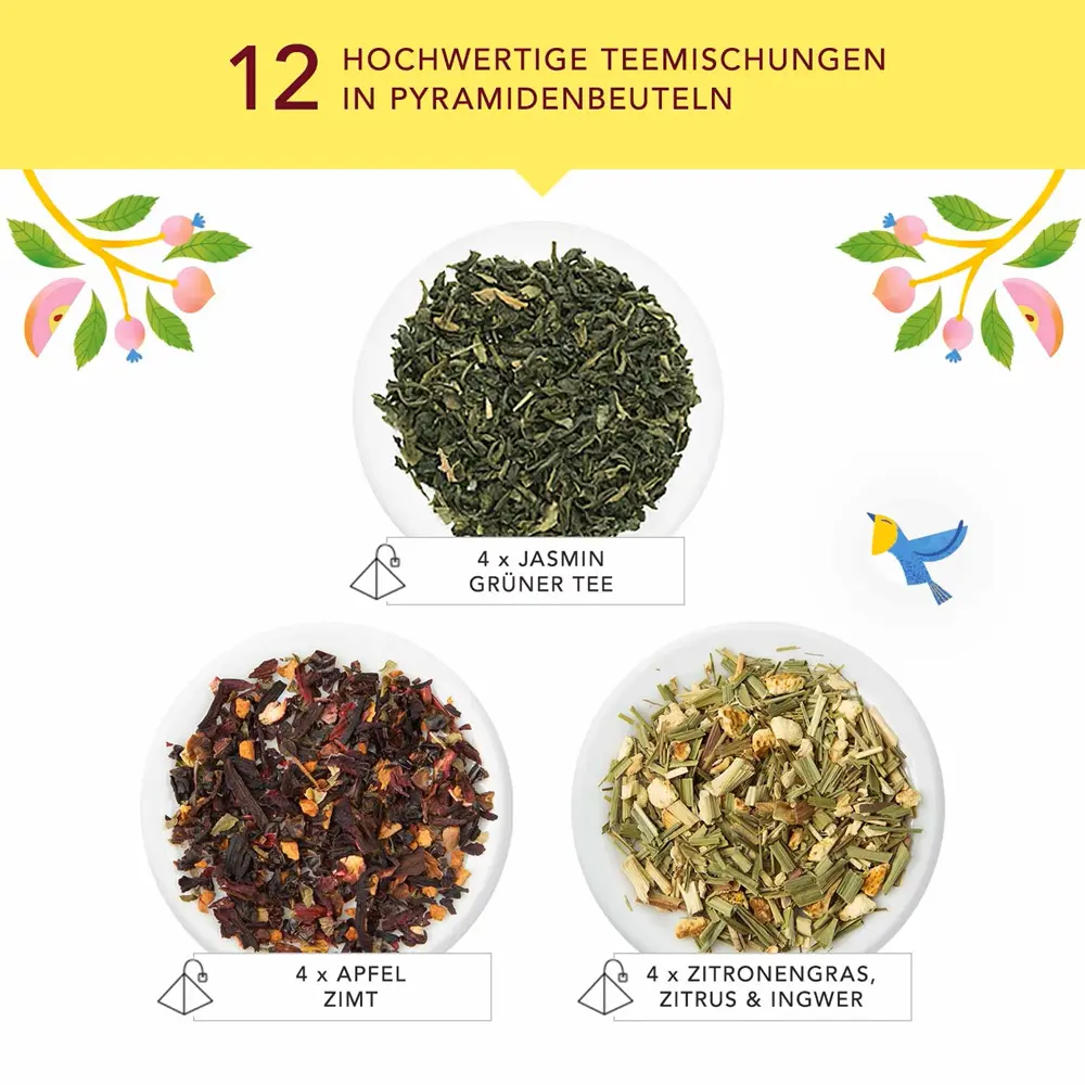 - MODERNE BIO TEE MISCHUNGEN: 3 x 4 verschiedene Tee Sorten in einer Geschenkbox aus nachhaltig angebauten Zutaten wie Grüner Tee, Zitronengras, Ingwer, Jasminblüten, Apfel & Zimt.
