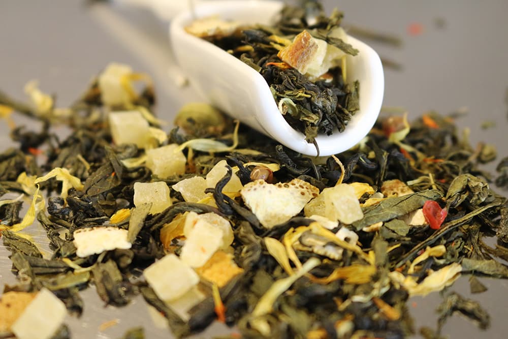 Grüner China Tee -Nebeltee, -Pi Lo Chun, -Sencha, kandierte Ananasstücke (Ananas, Zucker), Orangenschalen, natürliches Aroma, Kardamom, Saflorblüten, Ringelblumenblüten, rosa Pfeffer, Aprikosenstücke