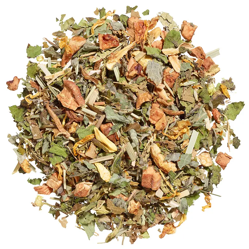 Apfelminze, Apfelstückchen, Lemongras (13%), Hibiskus weiß, Fenchel, Zitronenverbene (8%), Zitronenschale (8%), Zitronenmyrthe (6%), süße Brombeerblätter, Süßholzwurzel, Aroma, Ruhrkruatblüten, Ringelblumenblüten