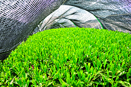 Nach einem langen Winterschlaf wachsen die Teepflanzen an den Hängen der Region Uji, nahe Kyoto, langsam zu ihrer vollen Pracht heran. 21-28 Tage vor der Ernte wird das gesamte Feld überschattet, sodass kein einziges Blatt mehr das direkte Licht der Sonne erblickt.